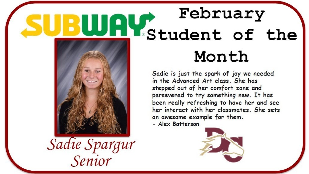 Congratulations to the Davis County High School April Students of the Month sponsored by Subway! To receive this award, students are nominated by their teachers/coaches for demonstrating great character, work ethic, and responsibility, among other qualities, and presented with a Student of the Month certificate and a free 6 inch meal at Subway.